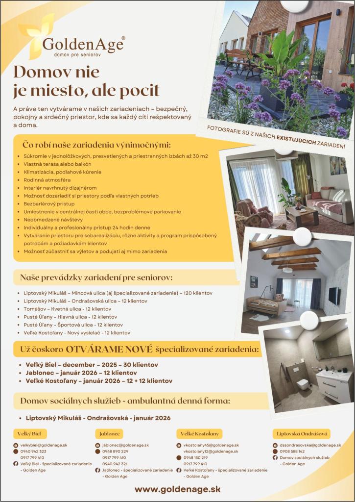 GoldenAge - dom pre seniorov informuje občanov, ktorí by potrebovali umiesniť rodinného príslušníka do špecializovaného zariadenia vo Veľkých Kostoľanoch. Od Januára 2026 otvárajú 2 nové zariadenia, kde naberajú nových klientov. Taktiež obsadzujú pracovné pozície ako opatrovateľka, upratovačka, zdravotná sestra alebo asistent.