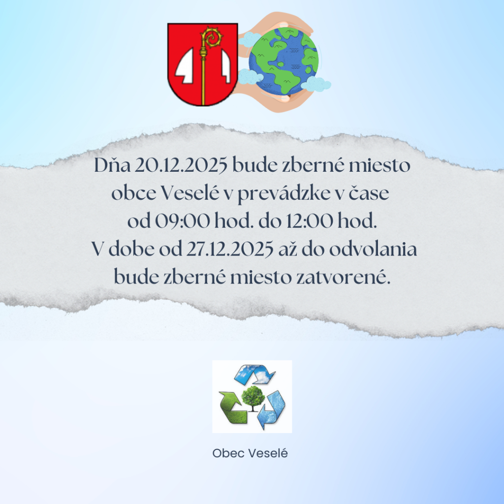 Dňa 20.12.2025 bude zberné miesto obce Veselé v prevádzke v čase od 09:00 hod. do 12:00 hod. V dobe od 27.12.2025 až do odvolania bude zberné miesto zatvorené.