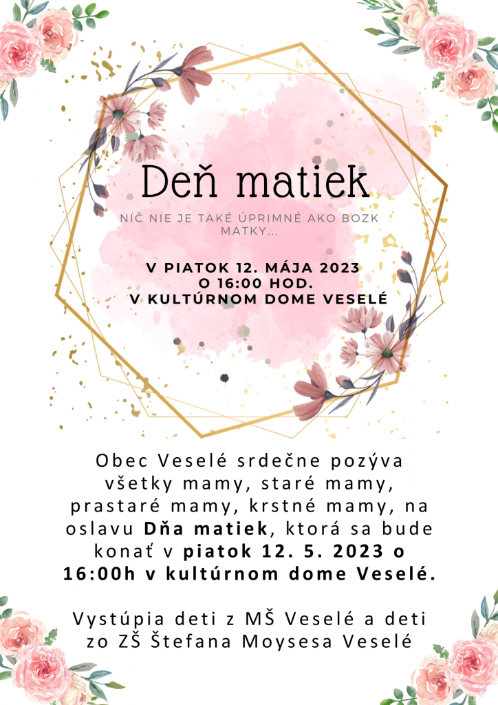 Deň matiek sa ukutočnil 12. mája 2023 v kultúrnom dome Veselé. Vystúpili deti z MŠ Veselé a deti zo ZŠ Štefana Moysesa Veselé.
