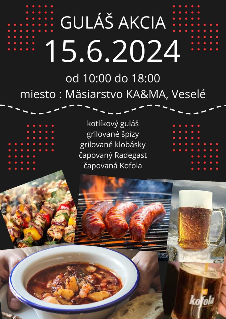 Mäsiarstvo KA&MA Vás pozýva na Gulášovú akciu dňa 15. 6. 2024 od 10:00 do 18:00 hod. pred mäsiarstvom KA&MA v obci Veselé.